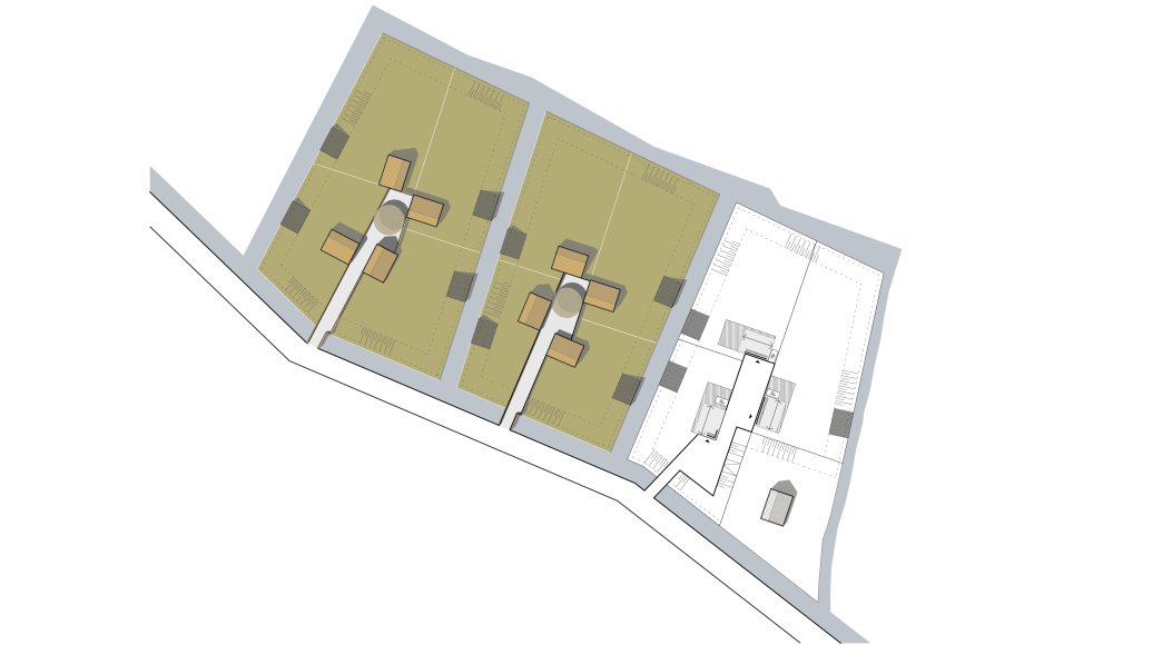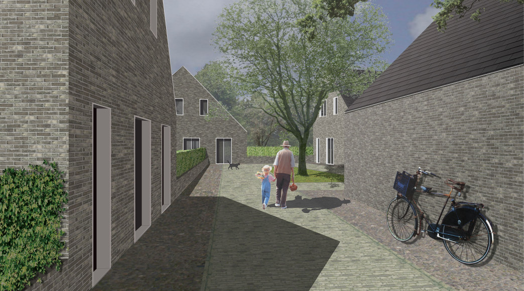 Elk eiland heeft een eigen erf dat vier kavels ontsluit. De woonhuizen en tuinmuren staan direct op de erfgrens en bepalen het beeld van het erf. Elke woning krijgt een pannendak met zadeldak met een lage en een hoge gootzijde. Er is een spel bedacht waarbij afwisselend een woning met een lage goot en een woning met een hoge goot aan het erf staat. Het ontwerp kenmerkt zich door een mooi contrast tussen het stenige erf en de grote groene tuinen.